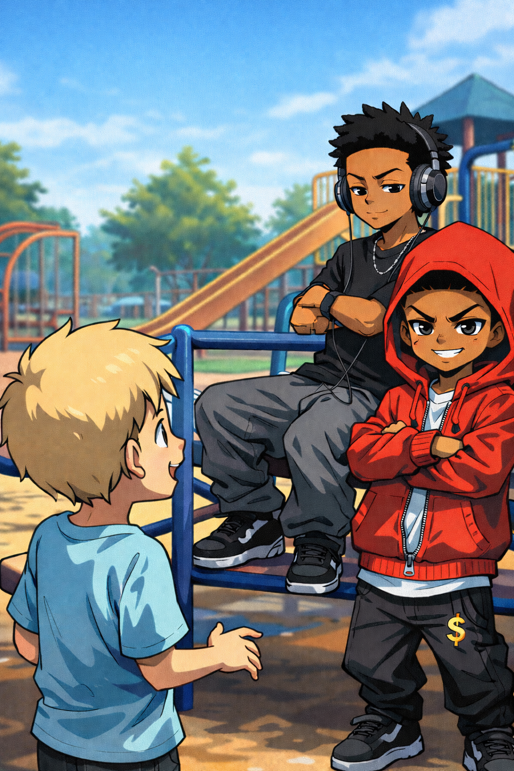 They’re the only Black kids there.A little white boy walks up, excited.White Kid: