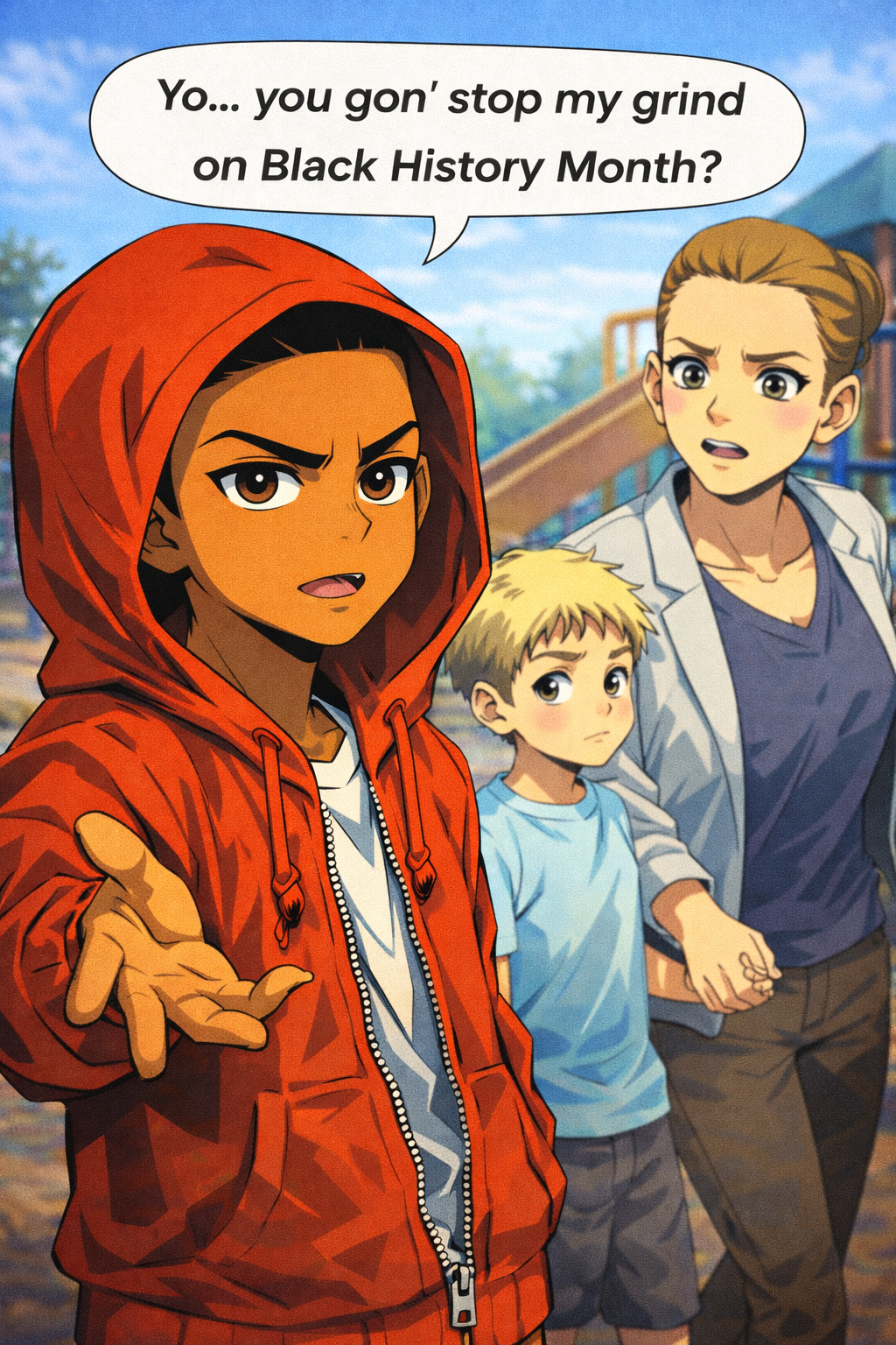 “Yo… you gon’ stop my grind on Black History Month?”The mom freezes.